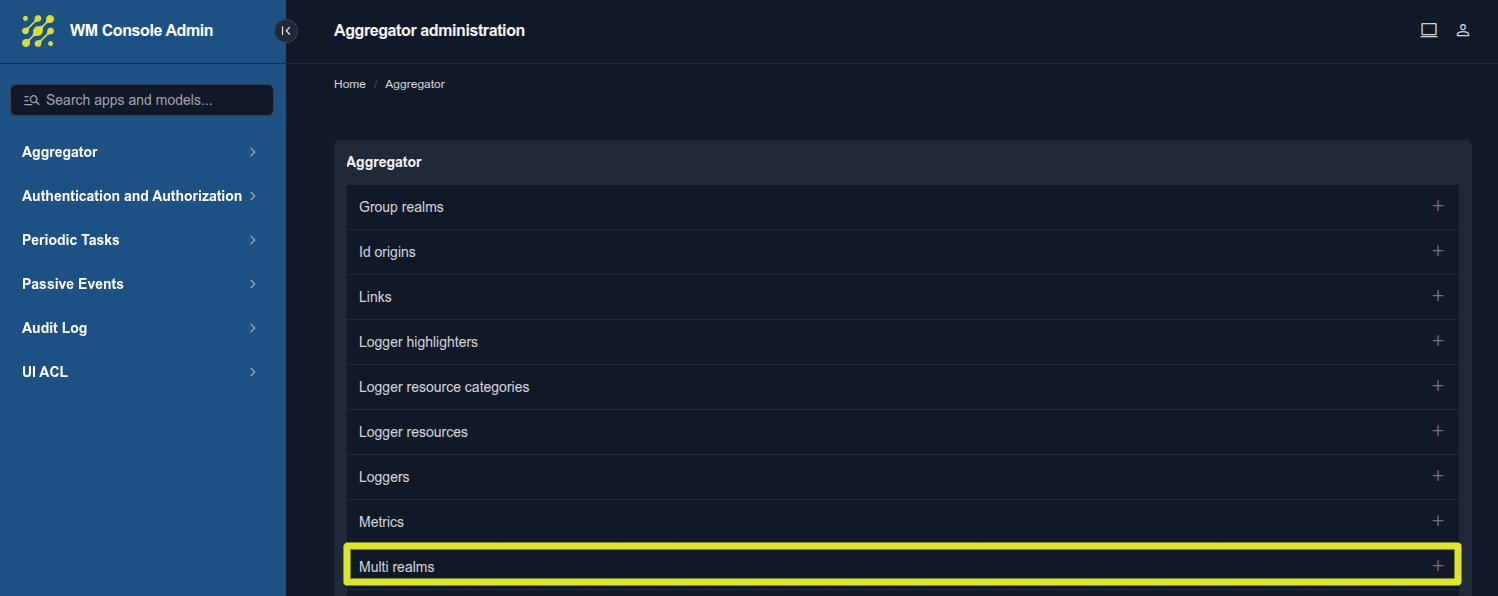 At this point it is possible to register a new Realm (+) to be part of the Multi-realm. For more information on this procedure, see the following link: Creation of Realms.