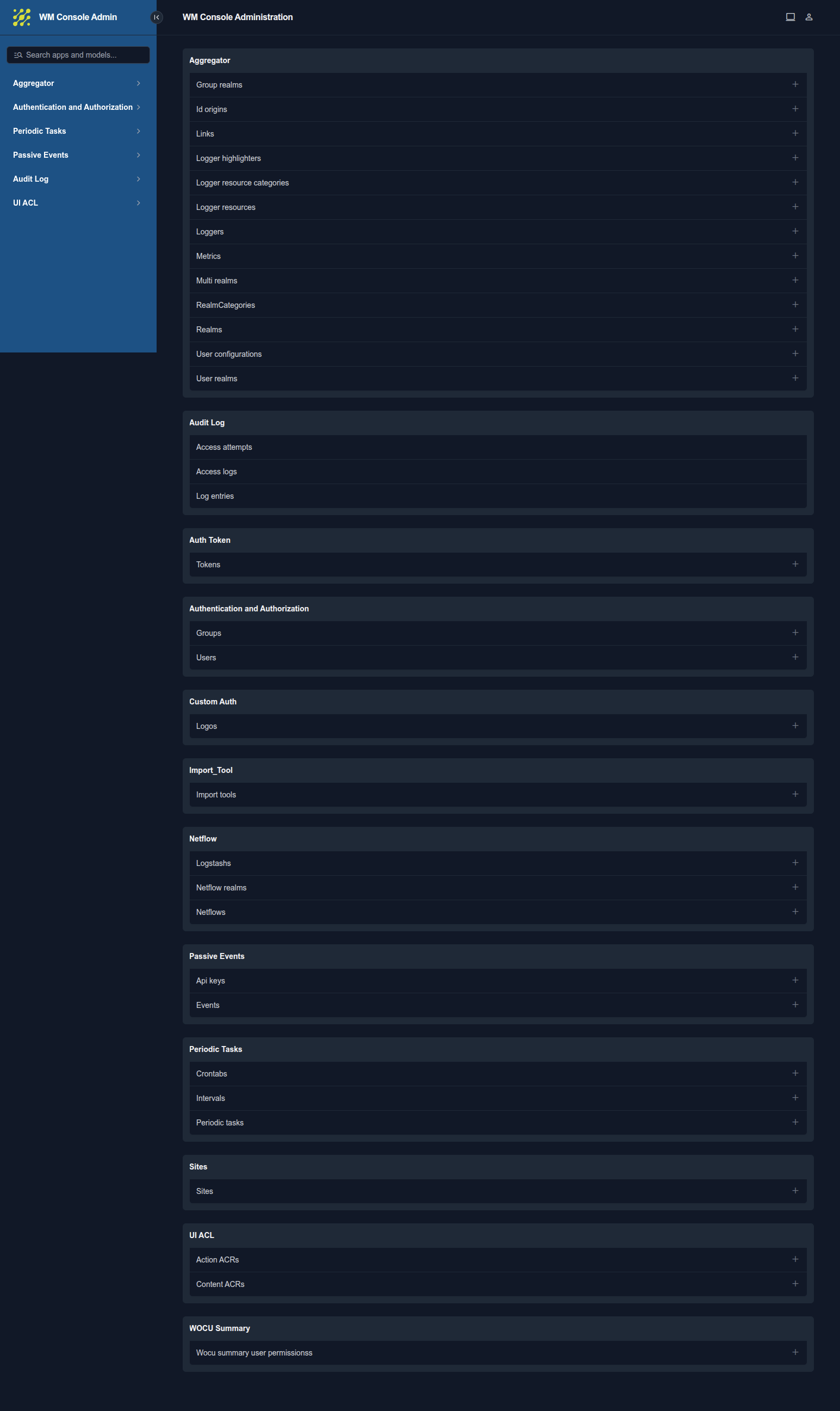 Haciendo clic sobre esta opción se accederá al módulo de Administración de WOCU (WOCU Administration), epicentro de multitud de funciones avanzadas de WOCU-Monitoring. Es posible realizar y establecer configuraciones más profundas de los elementos que integran la infraestructura tecnológica monitorizada, si bien exige unos mayores conocimientos técnicos por parte del usuario.