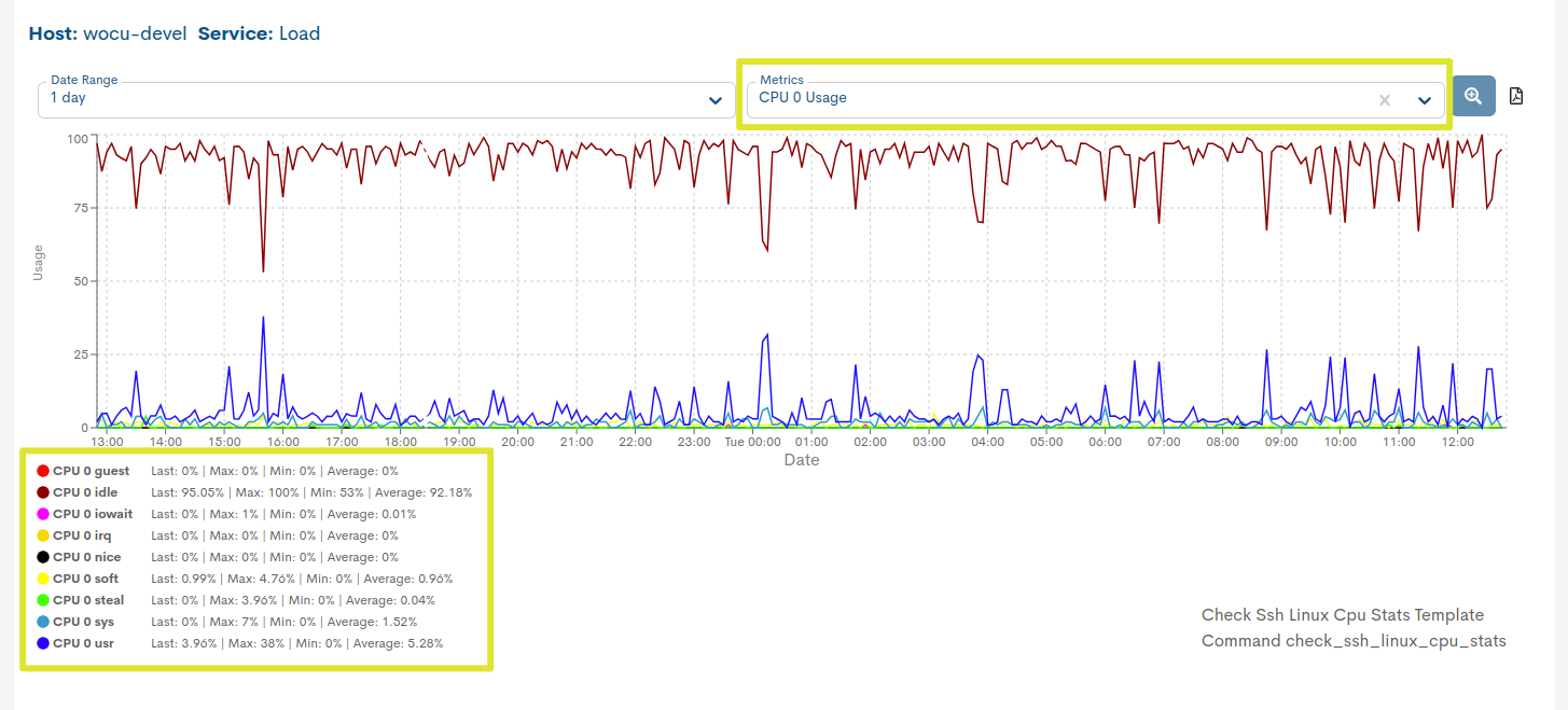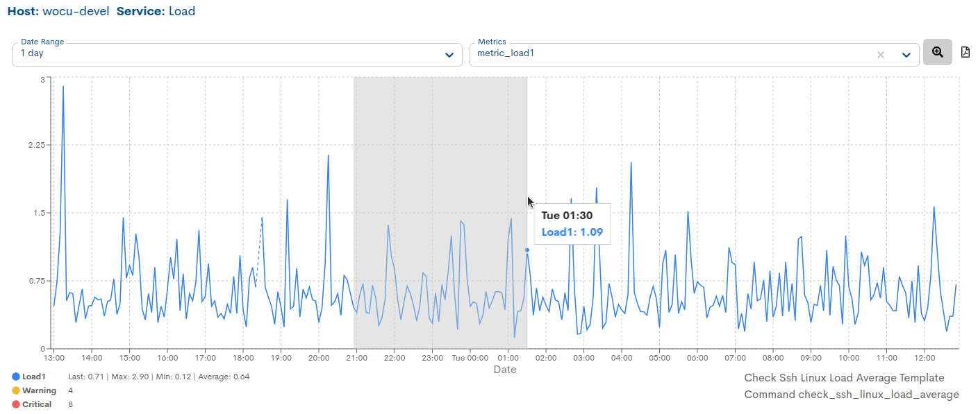 Esta vista ofrece información precisa sobre la evolución y operatividad del Servicio seleccionado, mediante valores de rendimiento recogidos por WOCU-Monitoring y almacenados en métricas durante un chequeo. Se visualizan a partir de gráficas que muestran datos recopilados en periodos de tiempo concretos, además de indicar umbrales definidos de estados Warning y Critical.