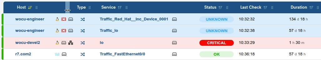Para una mejor compresión, el color de fondo de cada fila de la columna Status corresponde con uno de los posibles estados que el activo puede alcanzar. Por ejemplo, un color rosado para aquellos Servicios en estado Critical. Más información en: Estados de los Activos en WOCU.