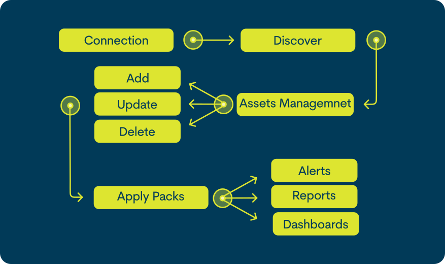 Para ello, se han desarrollado packs de monitorización específicos que se aplican de manera automática según la tipología del dispositivo, facilitando y estandarizando la monitorización. Los dispositivos descubiertos pasan inicialmente al estado Pending, lo que permite al administrador decidir cuáles activar para monitorización. A partir de ahí, el sistema gestiona de forma automática las altas, actualizaciones y bajas, aplicando los packs correspondientes y comenzando la recopilación de métricas. Toda la información se procesa y almacena de manera segura, integrándose en el entorno global de monitorización de WOCU-Monitoring para su explotación en alertas, informes y dashboards unificados. Más información en: Flujos de trabajo en la importación y administración de Activos.